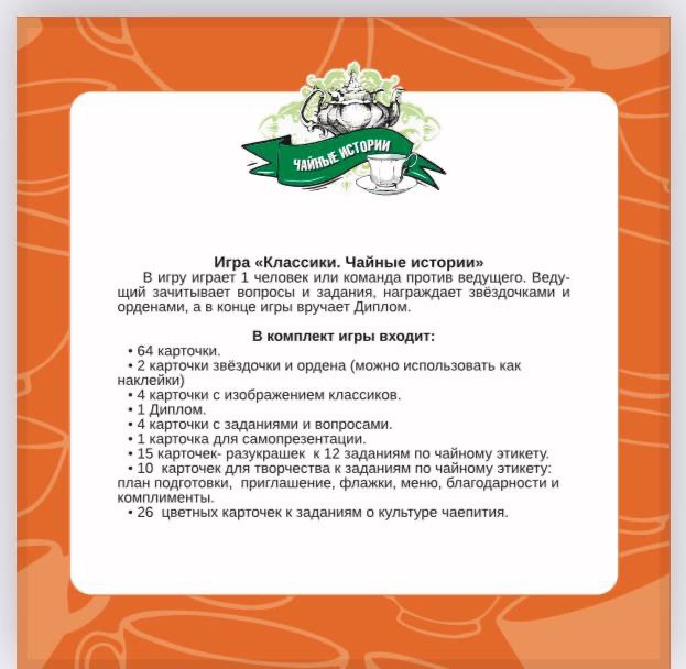 Игра - это комплект более 100 карточек, включая 2 Диплома, «Классики» - бланки для поощрительных наклеек, которые также прилагаются к игре, карточки с заданиями и карточки, взаимодействуя с которыми игроку предстоит решать этикетные задачки. В месте с этим, задания провоцируют развитие внимания, памяти и логического мышления. Любой творческий педагог или мама, имея такую игру и используя предложенные карточки, сможет сочинить множество своих заданий, а откопировав, можно предложить детям эти карточки для разукрашивания - это творческое занятие очень нравится детям.