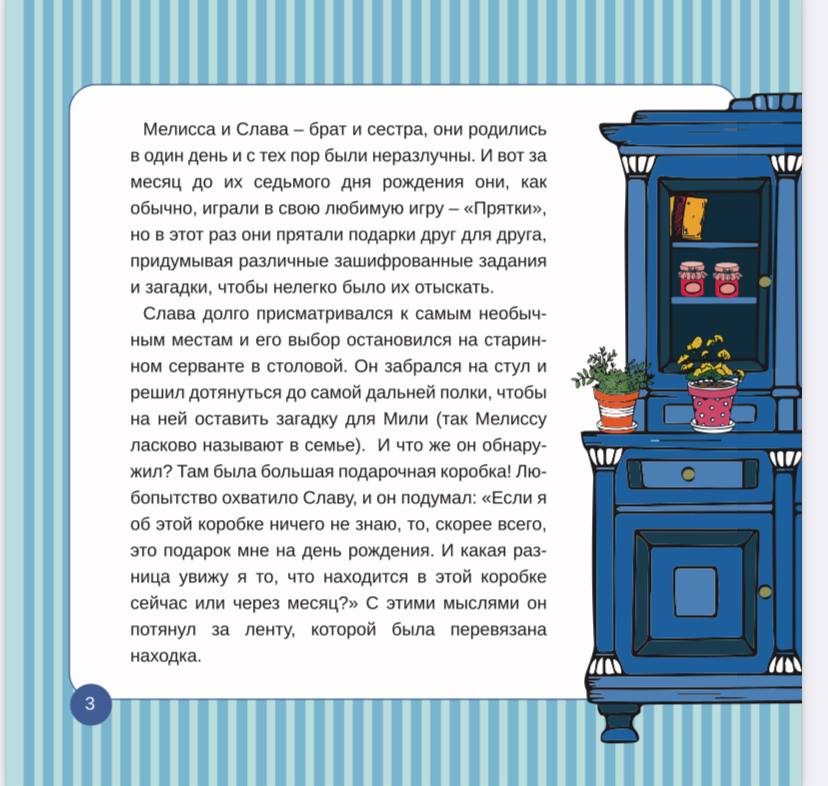 Главные герои двух книг - брат и сестра - Слава и Мелисса, поэтому книги привлекательны и для мальчиков, и для девочек, а также в сюжетах представлены мама, папа, папина сестра - Виктория и кот Гарфелд, которого Мелисса нашла в парке. Первая книга «Классики. Этикет для детей» знакомит юного читателя с традициями столового этикета, а в основе второй книги «Классики. Чайные истории» - преимущественно чайный этикет. Я постаралась описать поддерживающие и культурные взаимоотношения между членами семьи, предложила своё видение семейных традиций, которые могут быть полезными ориентирами в беседах взрослых и детей.